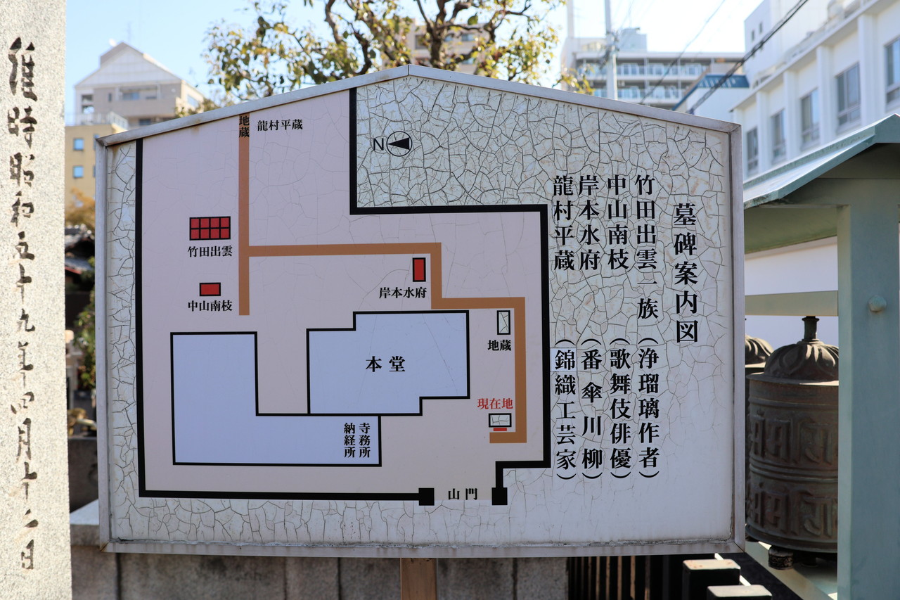 1945年(昭和20年)の大阪大空襲で堂宇は全焼したが、戦後鉄筋コンクリートの本堂が再建された。この本堂には、本尊大日如来、脇侍の不動・愛染明王、如意輪観音、弘法大師、四天王が祀られている。境内の墓所には「仮名手本忠臣蔵」などで知られる戯作者・竹田出雲の墓もあり、大阪市の史跡に指定されている。()